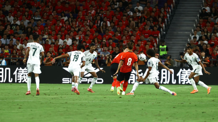 প্রথমার্ধে রক্ষণভাগের এক ভুলে পেনাল্টি থেকে পিছিয়ে পড়লেও, শেষ মুহূর্তে রাকিব হোসেনের দারুণ শটে সমতায় ফেরে বাংলাদেশ।