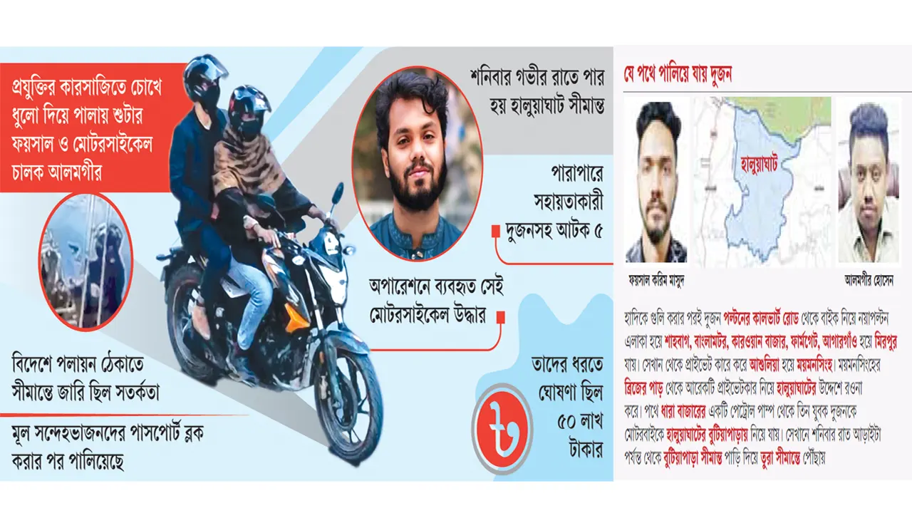 তদন্ত সংশ্লিষ্ট সূত্র বলছে, গত শনিবার গভীর রাতে ময়মনসিংহের সীমান্তঘেঁষা উপজেলা হালুয়াঘাটের একটি দুর্গম সীমান্ত পথ পাড়ি দিয়ে ভারতের মেঘালয়ে পালিয়ে যায় ফয়সাল ও আলমগীর। তাদের সীমান্ত পারাপারে সহায়তায় জড়িত দুই মানব পাচারকারীকেও (টাকার বিনিময়ে অবৈধভাবে সীমান্ত পারাপারে সহায়তাকারী, যারা দালাল নামে পরিচিত) আটক করেছে ঢাকা মহানগর পুলিশ (ডিএমপি)। এর আগে গত শুক্রবার দুপুরে রাজধানীর পল্টনের বক্স কালভার্ট রোডে মোটরসাইকেলে আসা দুই আততায়ীর একজন রিকশায় থাকা হাদিকে গুলি করে। পরদিন পুলিশের পক্ষ থেকে গুলি ছোড়া ফয়সালের ছবি প্রকাশ করে পুরস্কার ঘোষণা করা হয়। ফয়সাল করে গুলি, আর মোটরসাইকেলটি চালাচ্ছিল আলমগীর। গতকাল রোববার পুলিশ সেই মোটরসাইকেল উদ্ধারের কথা জানিয়েছে। হাদি আসন্ন জাতীয় সংসদ নির্বাচনে ঢাকা-৮ আসনের সম্ভাব্য স্বতন্ত্র প্রার্থী। সংকটাপন্ন অবস্থায় গতকাল পর্যন্ত রাজধানীর একটি বেসরকারি হাসপাতালে তার চিকিৎসা চলেছে। তবে আজ সোমবার দুপুরে একটি এয়ার অ্যাম্বুলেন্সে সিঙ্গাপুরে নেওয়ার কথা রয়েছে মাথায় গুলি লাগা হাদিকে। প্রধান উপদেষ্টার প্রেস উইং থেকে গতকাল রাতে এ তথ্য জানানো হয়। প্রেস উইং জানিয়েছে, প্রধান উপদেষ্টা অধ্যাপক মুহাম্মদ ইউনূসের নির্দেশে গতকাল সংস্কৃতি উপদেষ্টা মোস্তফা সরয়ার ফারুকী, প্রধান উপদেষ্টার স্বাস্থ্য মন্ত্রণালয়বিষয়ক বিশেষ সহকারী অধ্যাপক ডা. মো. সায়েদুর রহমান, এভারকেয়ার হাসপাতালের বিশেষজ্ঞ চিকিৎসক ডা. জাফর ও ওসমান হাদির ভাই ওমর বিন হাদির মধ্যে এক জরুরি টেলিফোন কনফারেন্সে এ বিষয়ে সিদ্ধান্ত হয়।